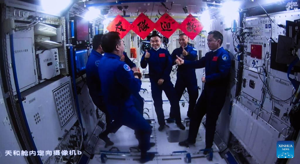 Jing said he and his team were very happy and excited to see their "brothers from Shenzhou XVII". He pointed to a banner his team had placed inside the Tianhe module that read, "Welcome, our teammates".